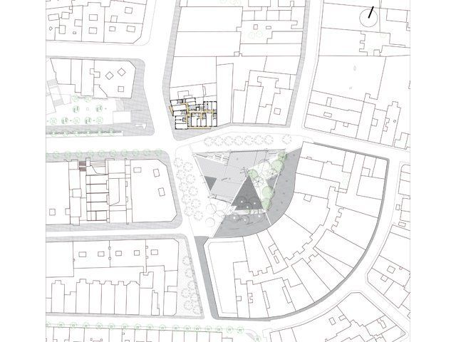 Situat en una cantonada important de la ciutat, l'edifici pretén destacar entre l'arquitectura que l'envolta mitjançant un gran volum que sobresurt de la façana i la introducció de materials actuals.