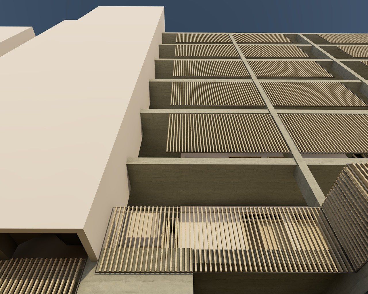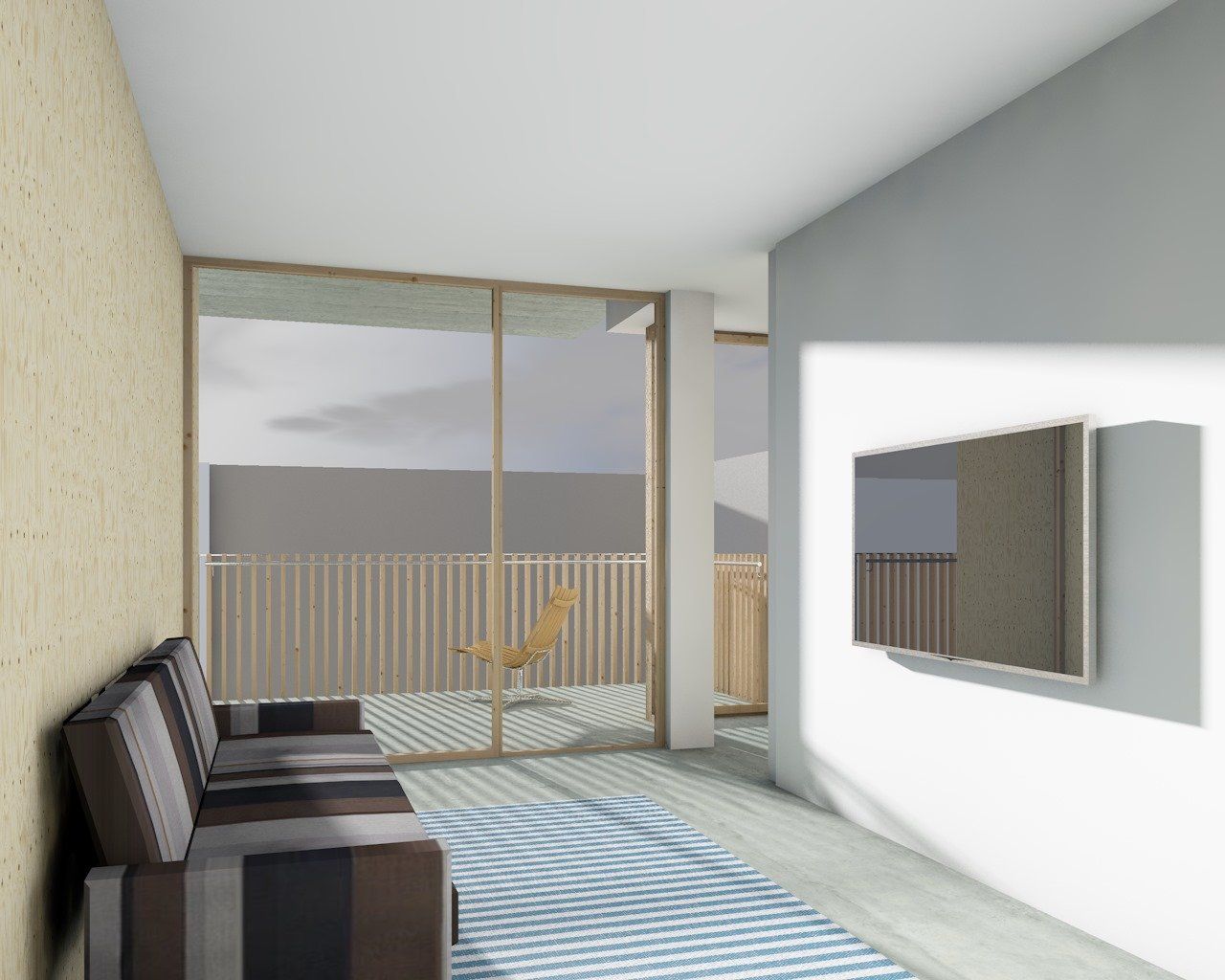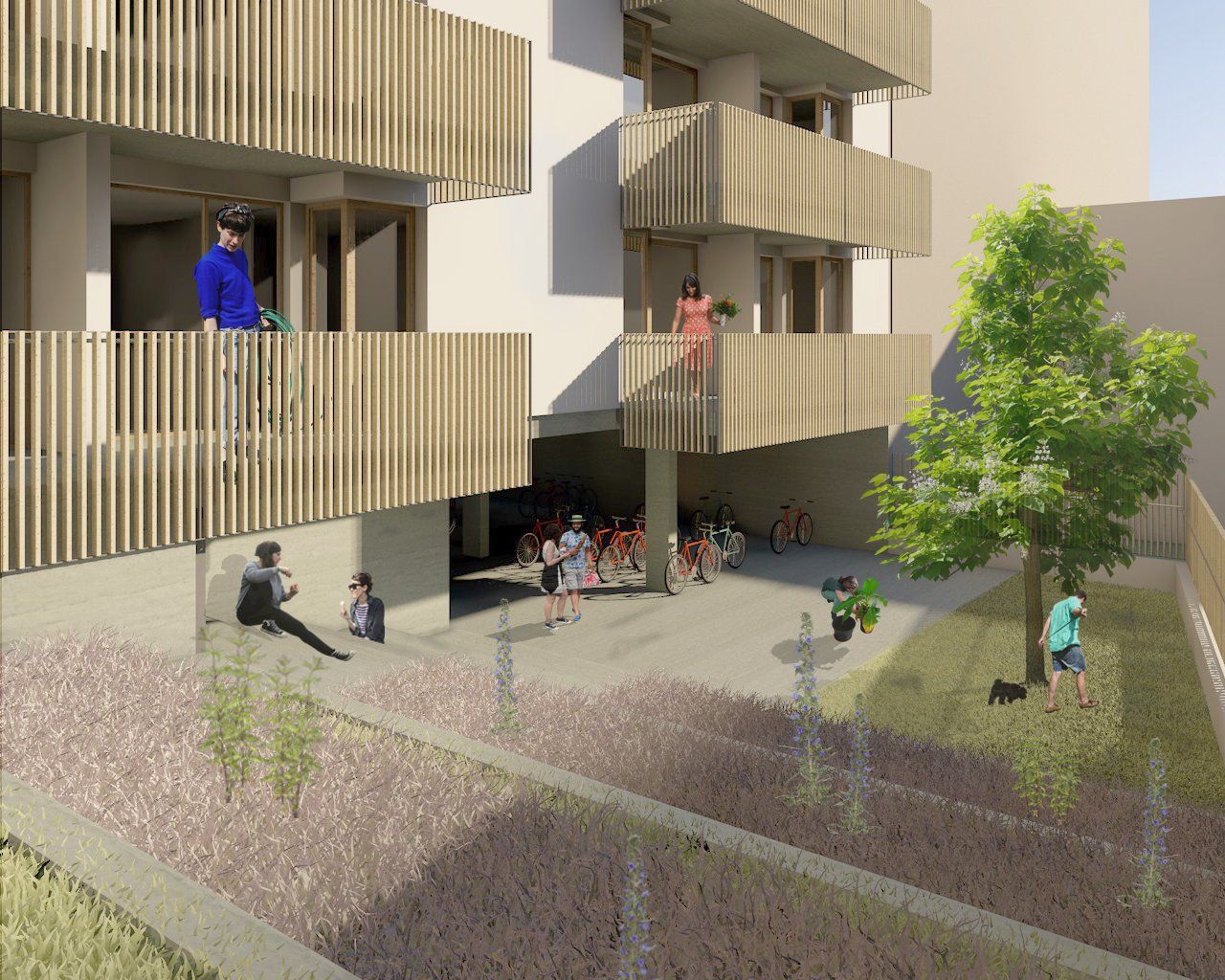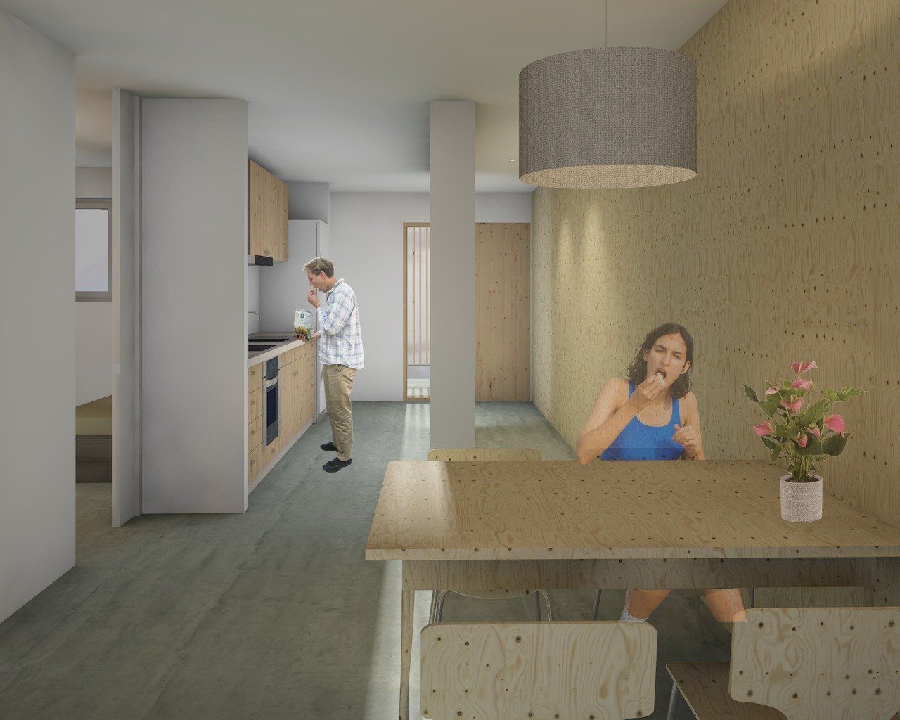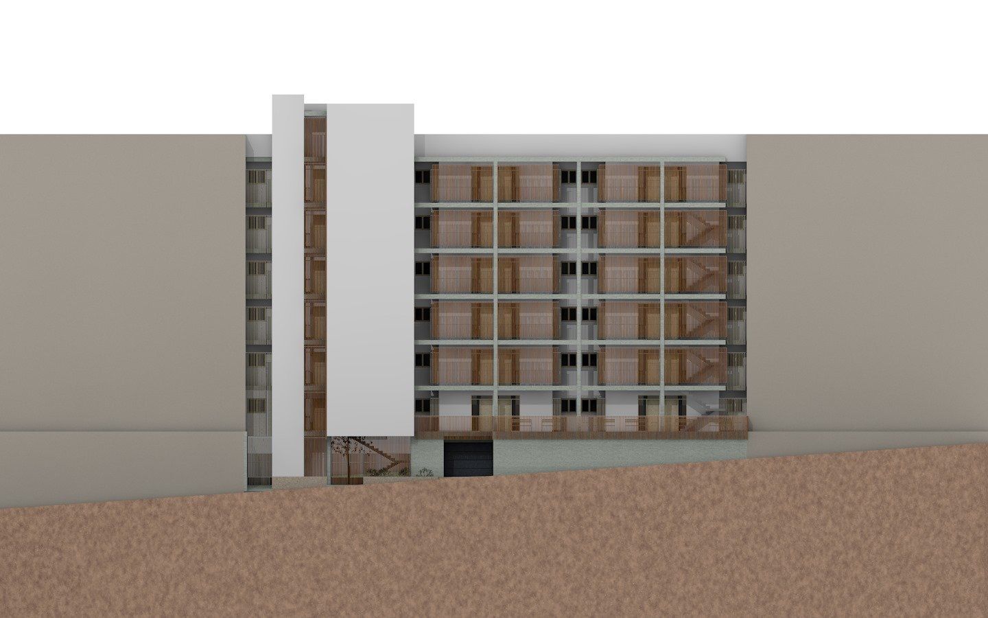 L'accés als habitatges s'efectua des de l'escala o l'ascensor, per la passera oberta situada a façana nord i que és concebuda també com a espai de relació i apropiació veïnal. L'escala, en ser protegida, configura un volum que caracteritza la façana. L'ascensor arribarà fins a coberta per poder gaudir de l'enjardinament d'aquesta. A l'interior es configura un espai net passant, que conté estar, menjador i cuina (pologia tancada o oberta). Les dues habitacions disposen gairebé de les mateixes mesures, evitant així que existeixi jerarquia entre elles. A la façana sud es sitúen la sala i una habitació que tenen assegurat l'assolellament durant tot l'any. La terrassa com a espai intermedi també amb tancaments de fusta i prou mida per ser habitat, fa el paper de coixí tèrmic i ilumina tot l'espai interior.