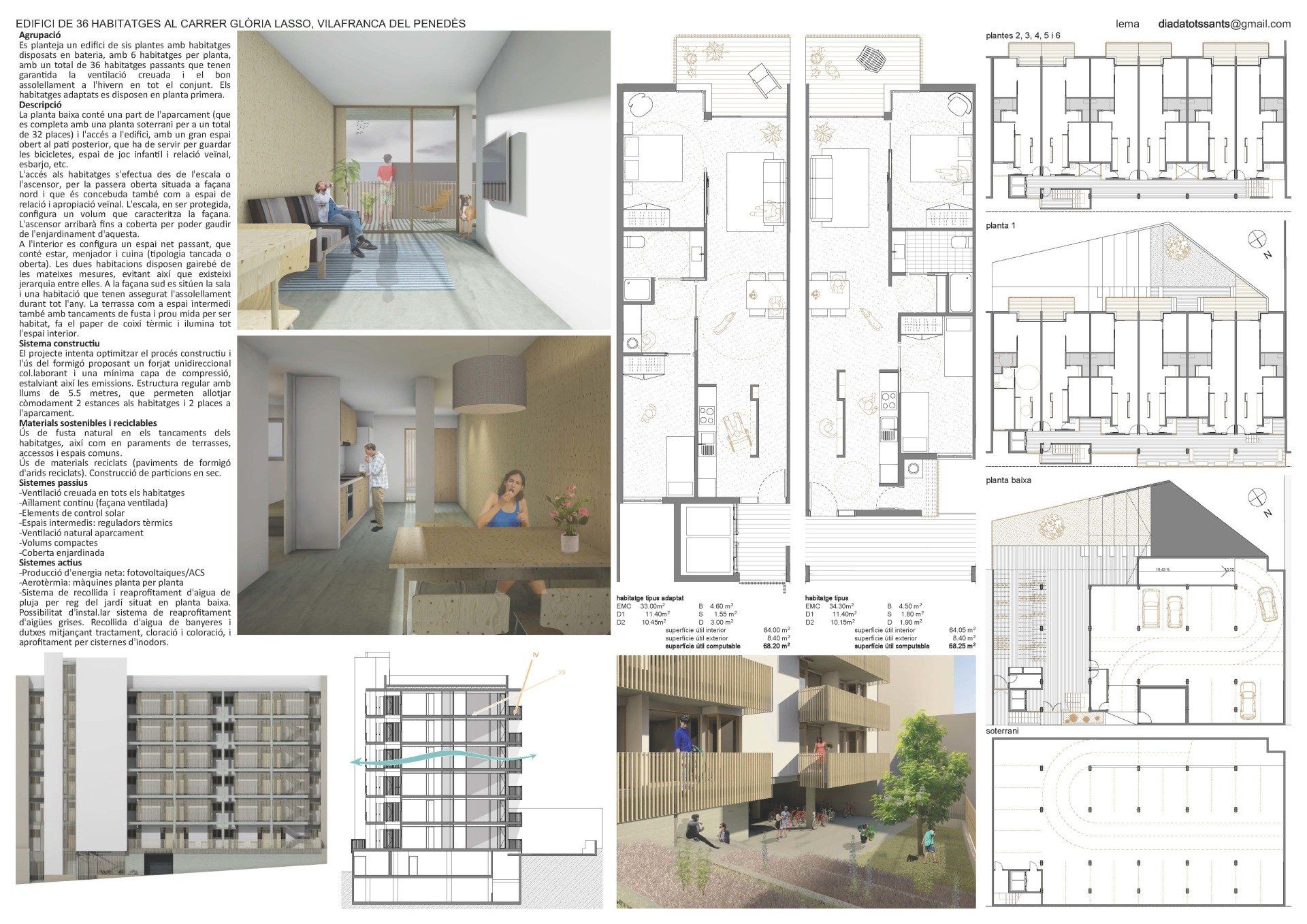 Es planteja un edifici de sis plantes amb habitatges disposats en bateria, amb 6 habitatges per planta, amb un total de 36 habitatges passants que tenen garantida la ventilació creuada i el bon assolellament a l'hivern en tot el conjunt. Els habitatges adaptats es disposen en planta primera.